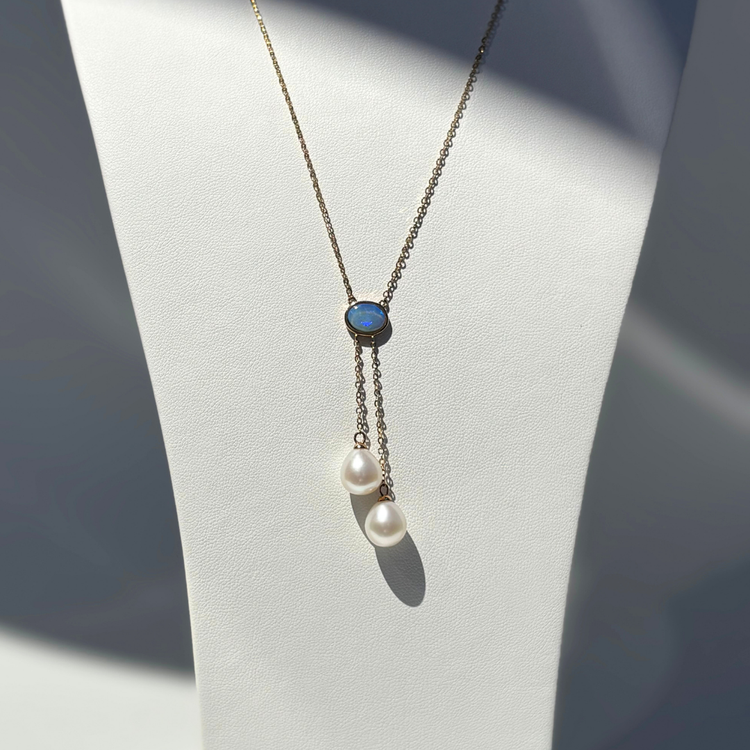 Introducing our Oceanides Lariat Necklace, a stunning piece crafted in 9ct yellow gold, exuding sophistication and elegance. This opal "Y" necklace features a lariat style design, adorned with a captivating solid Light Opal that showcases mesmerising colour play. Suspended from the opal are two lustrous Cultured Freshwater pearls in a drop shape, adding a touch of grace to the ensemble. The opal, sourced from South Australia, adds to the allure of this exquisite necklace.