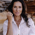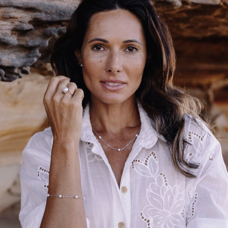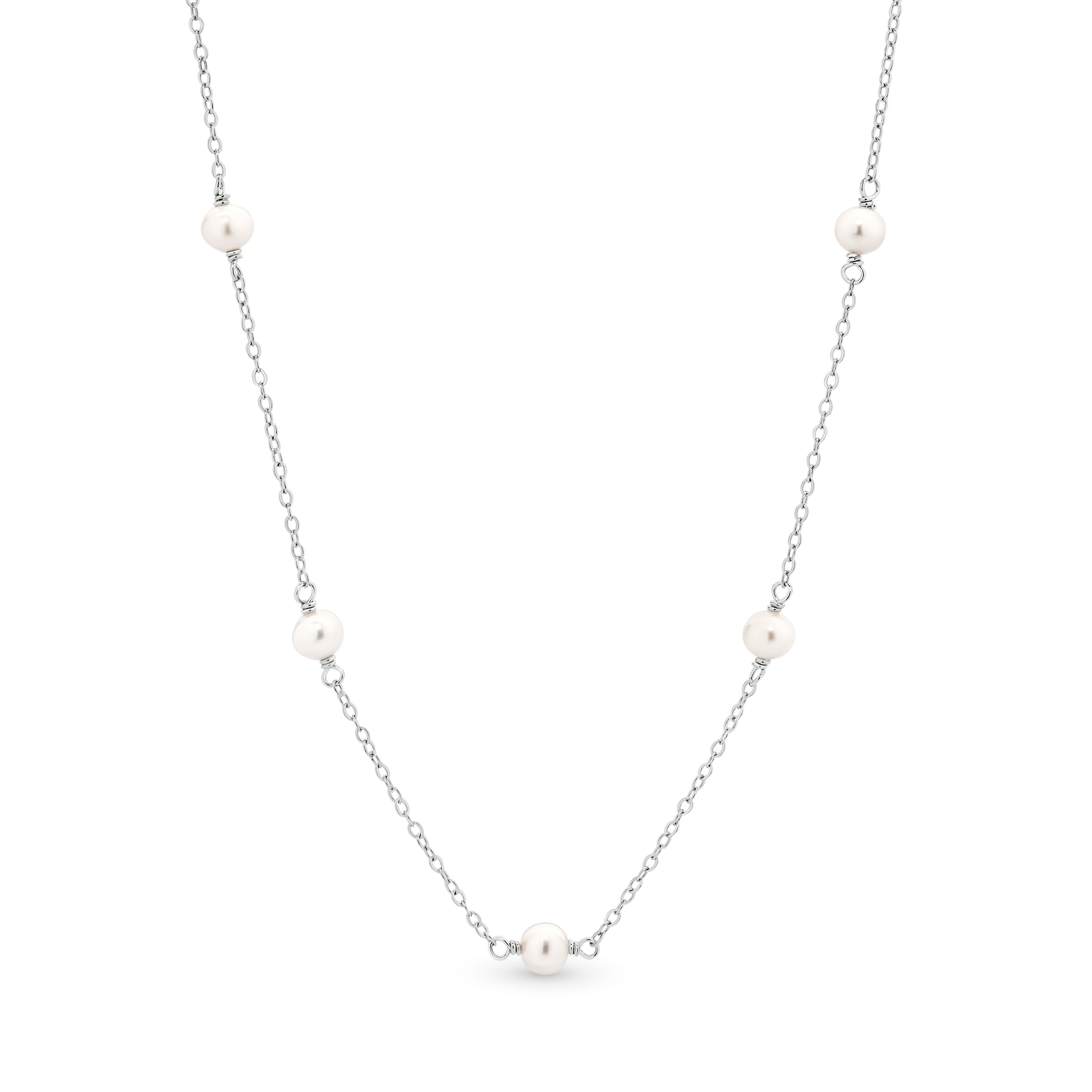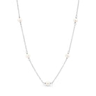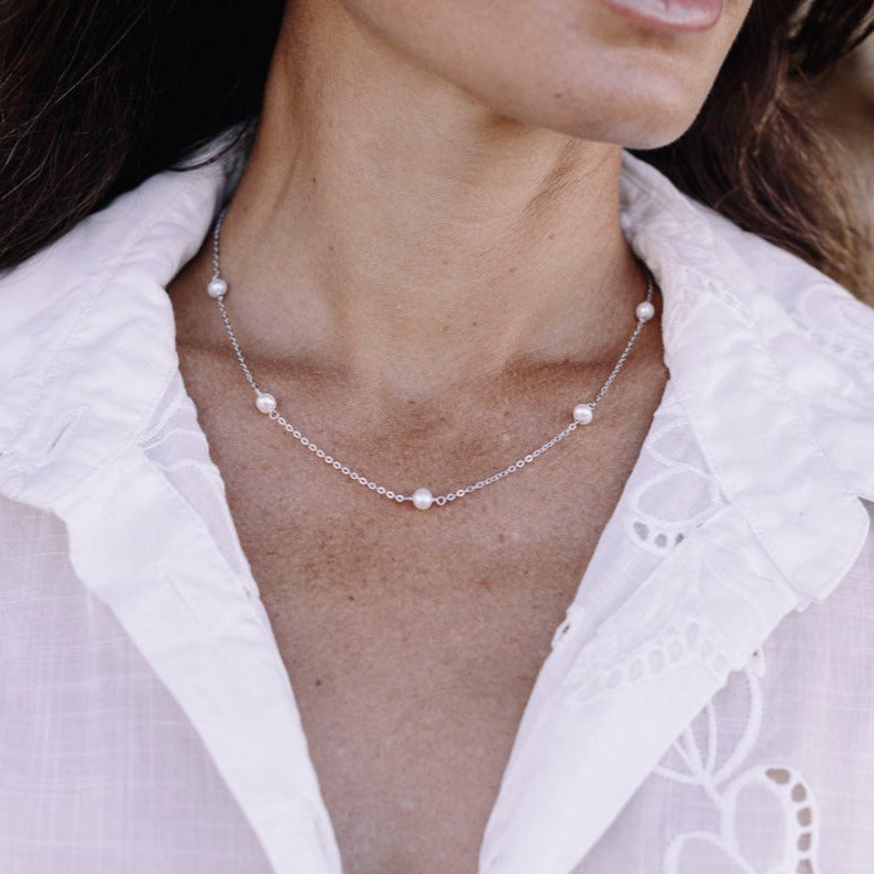 Elegantly crafted from sterling silver, this necklace features small white oval freshwater pearls gracefully spaced with short lengths of chain, creating a delicate and charming accessory perfect for adding a touch of understated beauty to any ensemble. Combine with the Elodie Bracelet to create a stunning ensemble.