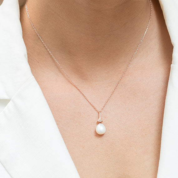 Understated elegance with a touch of sparkle - the Sue Pendant features a luminous white freshwater pearl, delicately suspended beneath a 9ct rose gold setting accented with sparkling diamonds. A refined piece that brings timeless beauty to everyday wear or special occasions.