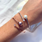 This fashionable and sleek bangle is one of our new favourites. Featuring a pink Edison Pearl it creates an every day option for a simple but elegant bangle.