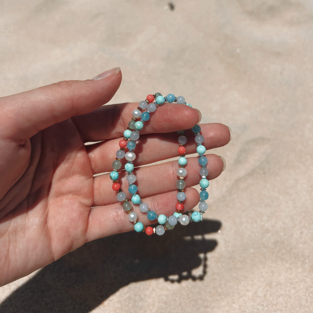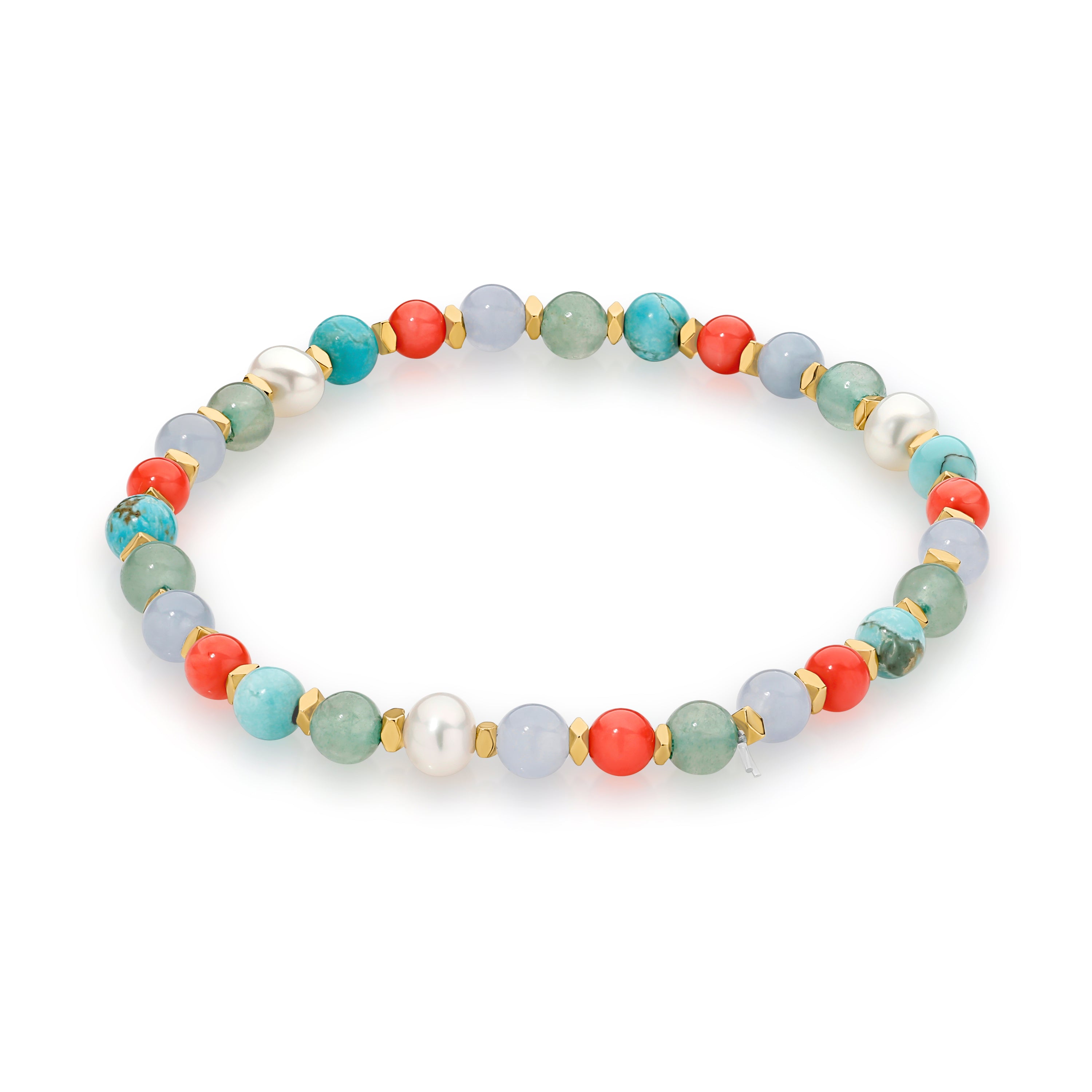 The Tulip Bracelet is a fun and colourful piece, perfect for little jewellery lovers. Featuring a playful mix of natural Bamboo Coral, Sponge Quartz, Howlite, and Green Aventurine beads, accented with delicate freshwater pearls, this elastic bracelet is both lightweight and comfortable to wear. It’s a lovely everyday accessory or a special gift for a little one who loves a bit of sparkle.