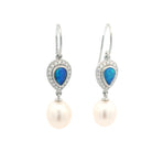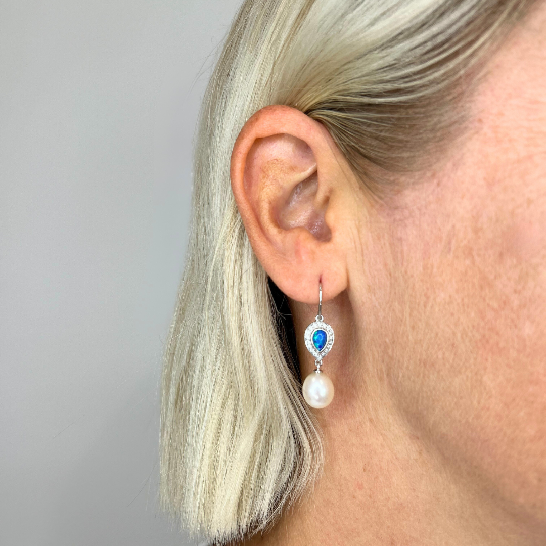The Winnie Hook Earrings are expertly crafted from sterling silver, featuring a delicate pear-shaped solid light opal at the top, surrounded by a shimmering halo of cubic zirconias. A graceful drop of white pearl adds an elegant finishing touch, creating a timeless and sophisticated design.