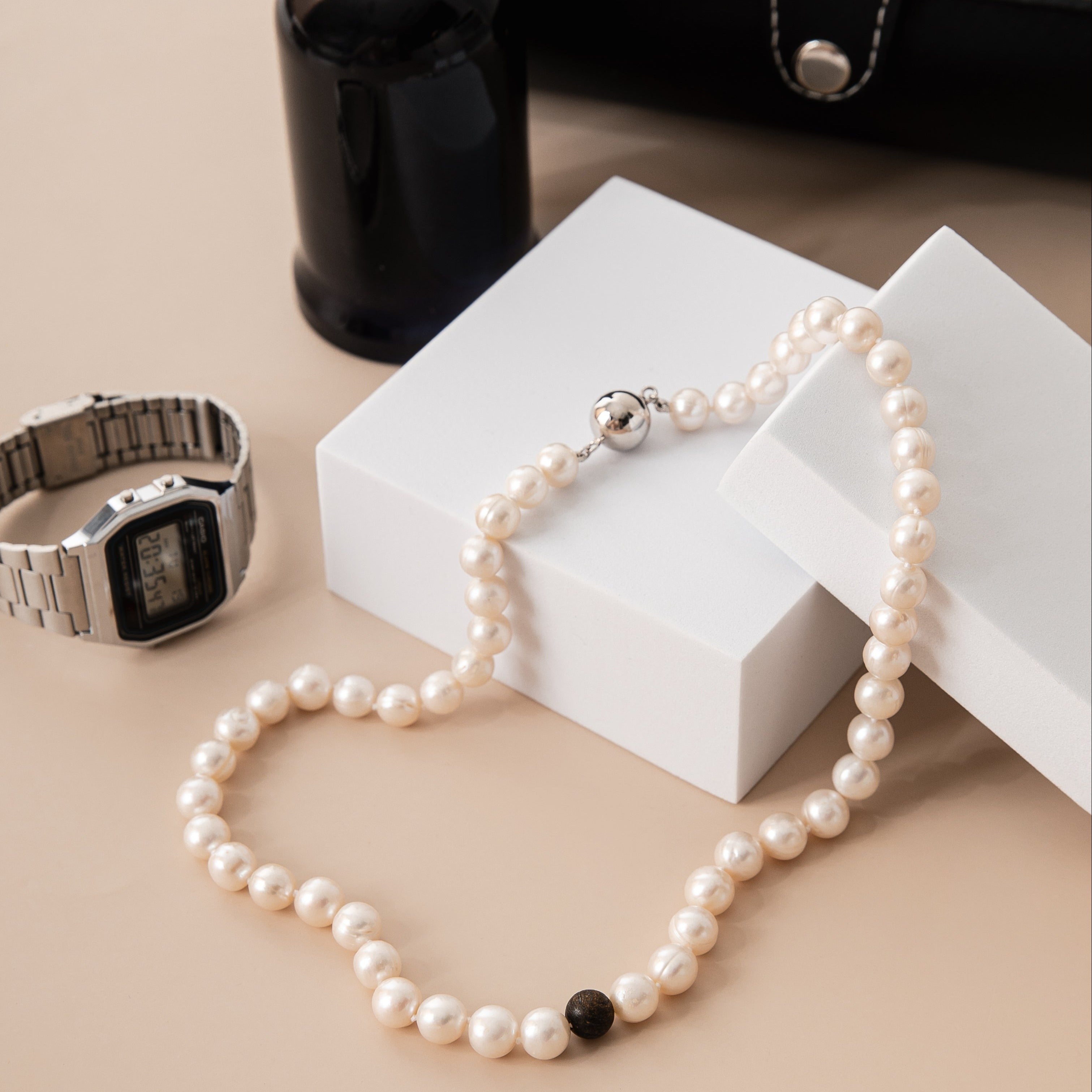 The Harry Necklace, a favoured choice among men, combines the timeless elegance of white freshwater pearls and the bold presence of the Bronzite feature bead exudes elegance and masculinity. Its secure stainless steel magnetic clasp ensures both style and convenience in one accessory.
