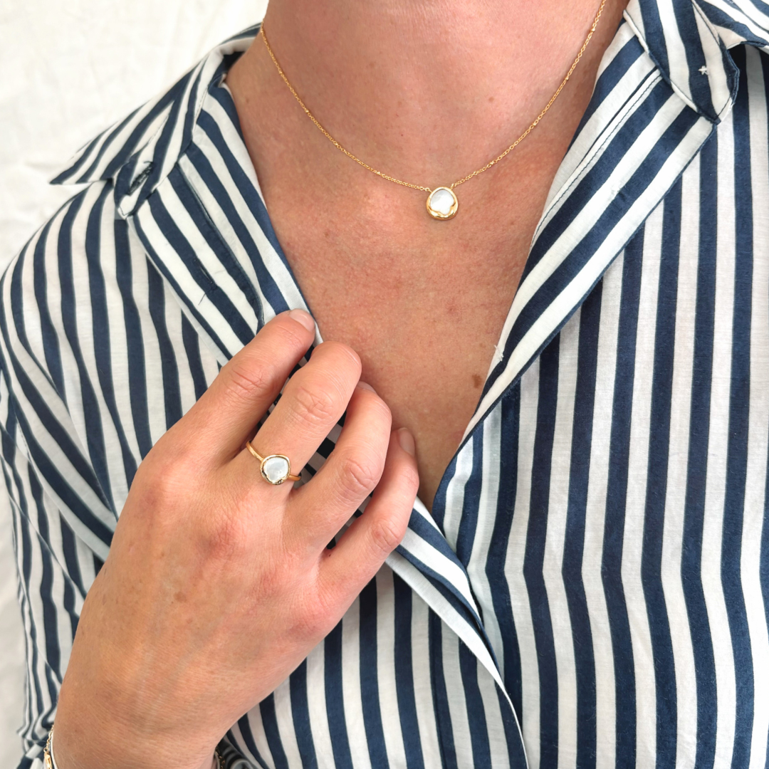 Elegant and effortless, the Kiara Necklace features a uniquely shaped white Mother of Pearl pendant set in yellow gold-plated sterling silver. Suspended on a chain, this piece brings a soft, luminous glow to any neckline — perfect for layering or wearing solo as a subtle statement.