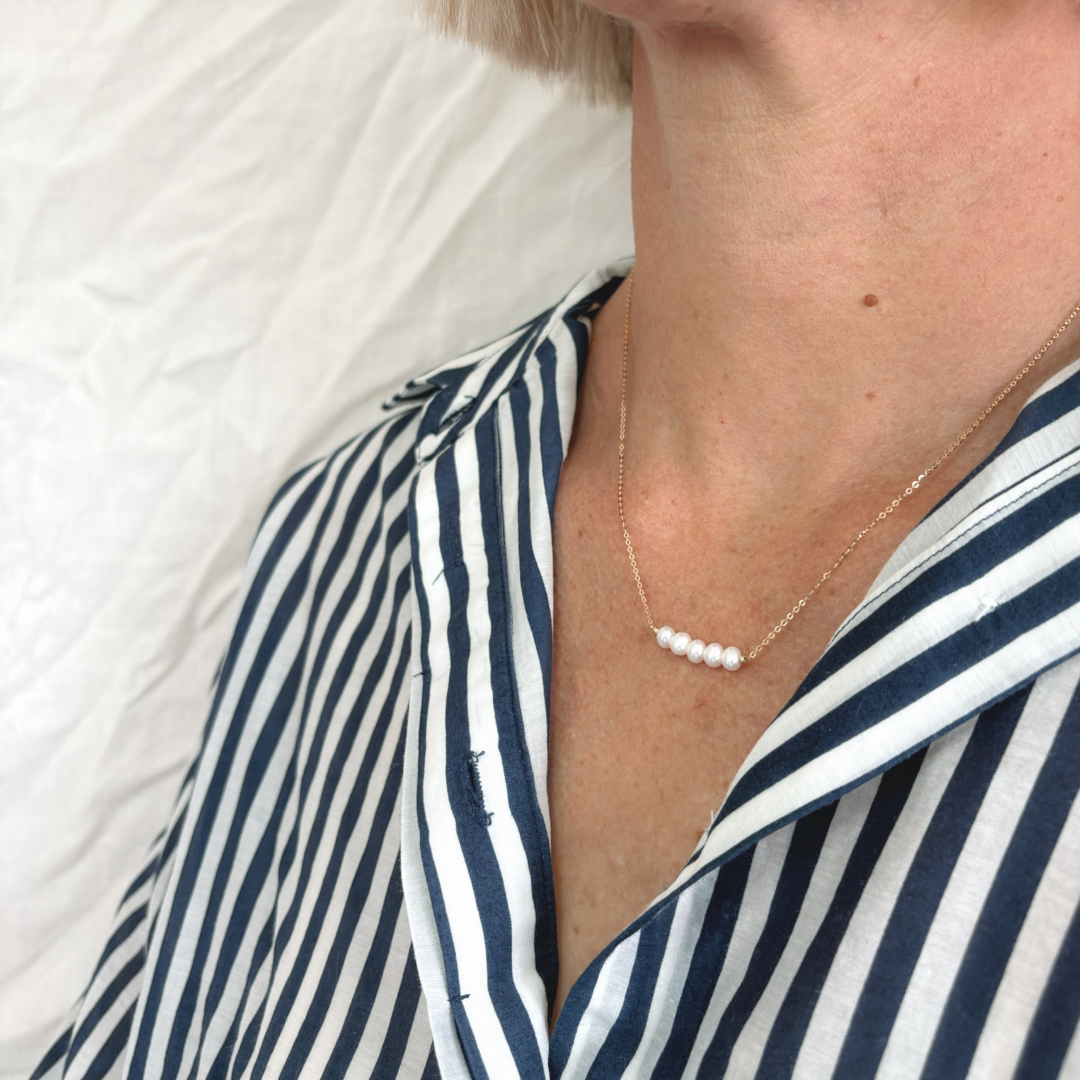 Delicate with a touch of whimsy, the Phoebe Necklace features five petite freshwater pearls nestled together at the centre of a fine 14ct yellow gold chain. This graceful arrangement adds a soft focal point to any neckline — a timeless piece that brings effortless polish to everyday looks.