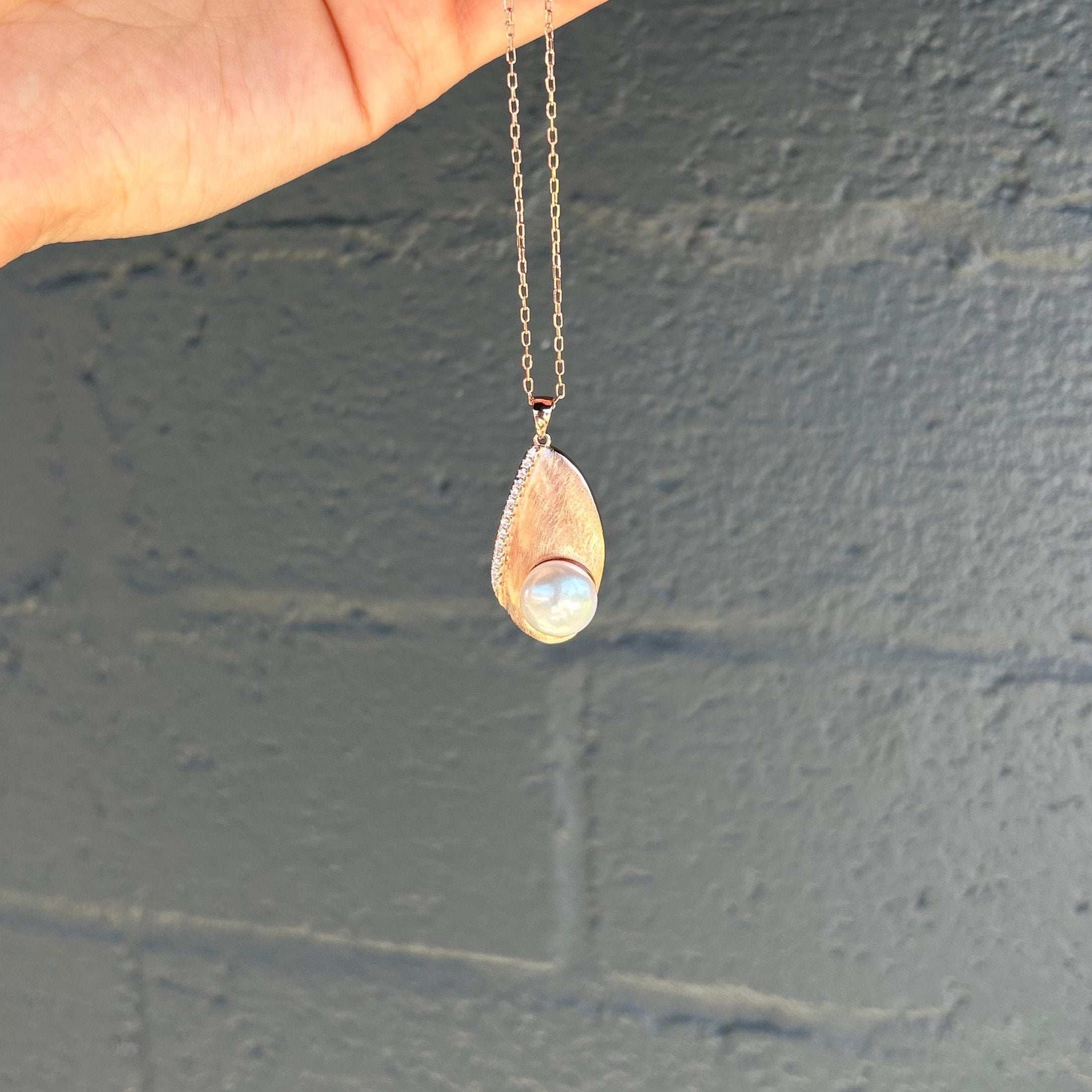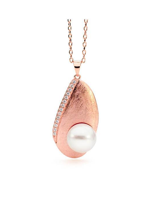 Exquisitely refined, this unique design is perfect for those who appreciate pearls with a modern twist. Featuring 14ct rose gold plating, the frosted finish highlights a flawless drop pearl, complemented by sparkling cubic zirconia accents along the edges. This stylish piece is an elegant choice for any occasion.