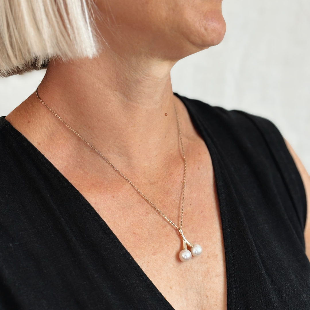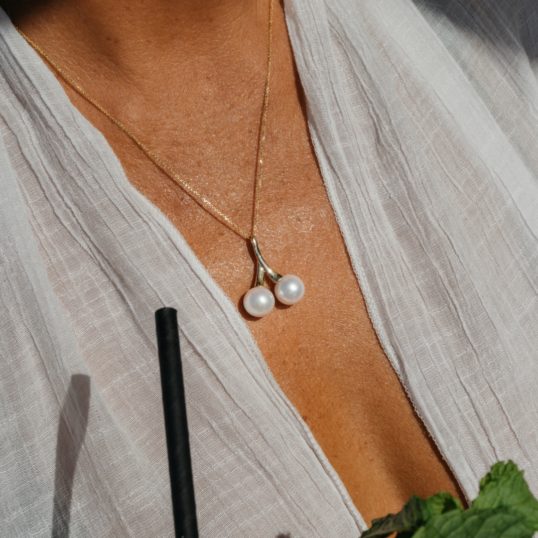 A statement in refined elegance, the Juniper Pendant features two luminous Edison freshwater pearls, beautifully set in 9ct yellow gold. With its double-drop design and radiant finish, this pendant is a timeless expression of sophistication — perfect for marking a special occasion or elevating everyday wear.