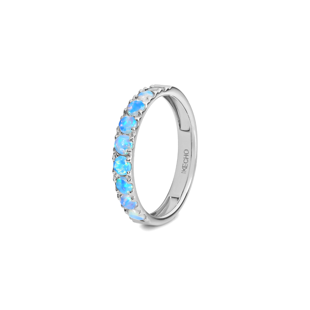The Milky Way Stacking Ring brings a subtle glow to your everyday style, featuring a fine band set with a delicate row of shimmering Australian light opals. Crafted in your choice of 9ct gold or sterling silver, it captures the ethereal beauty of opal in a modern, understated design. Perfect for stacking or wearing solo, this refined piece adds a touch of celestial charm to any look.