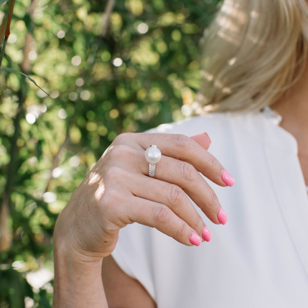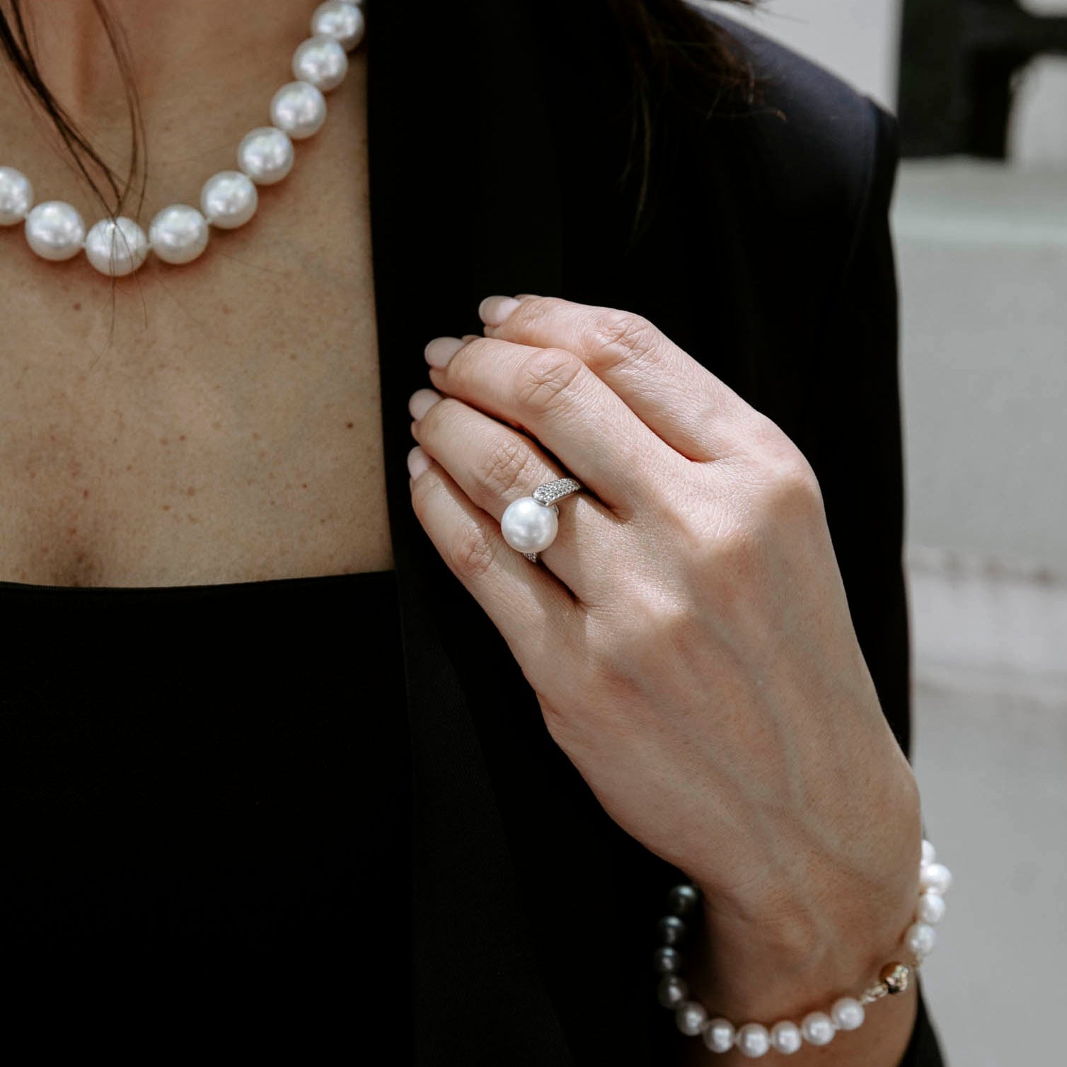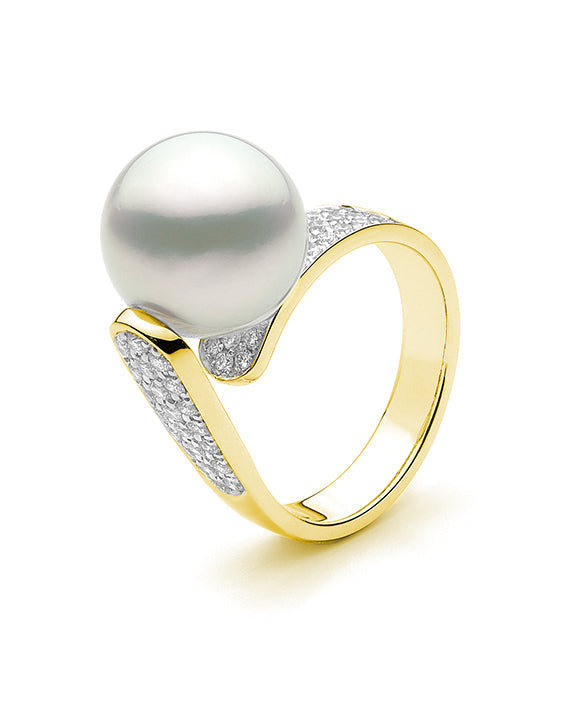 Radiate unparalleled elegance with this exquisite pearl and diamond ring. This luxurious piece of jewellery is meticulously handcrafted from luminous 9K gold, offering the perfect stage for the shimmering gemstones that adorn it. At its heart stands a magnificent South Sea Cultured pearl, boasting an ivory hue that reflects sumptuous highlights under any light.