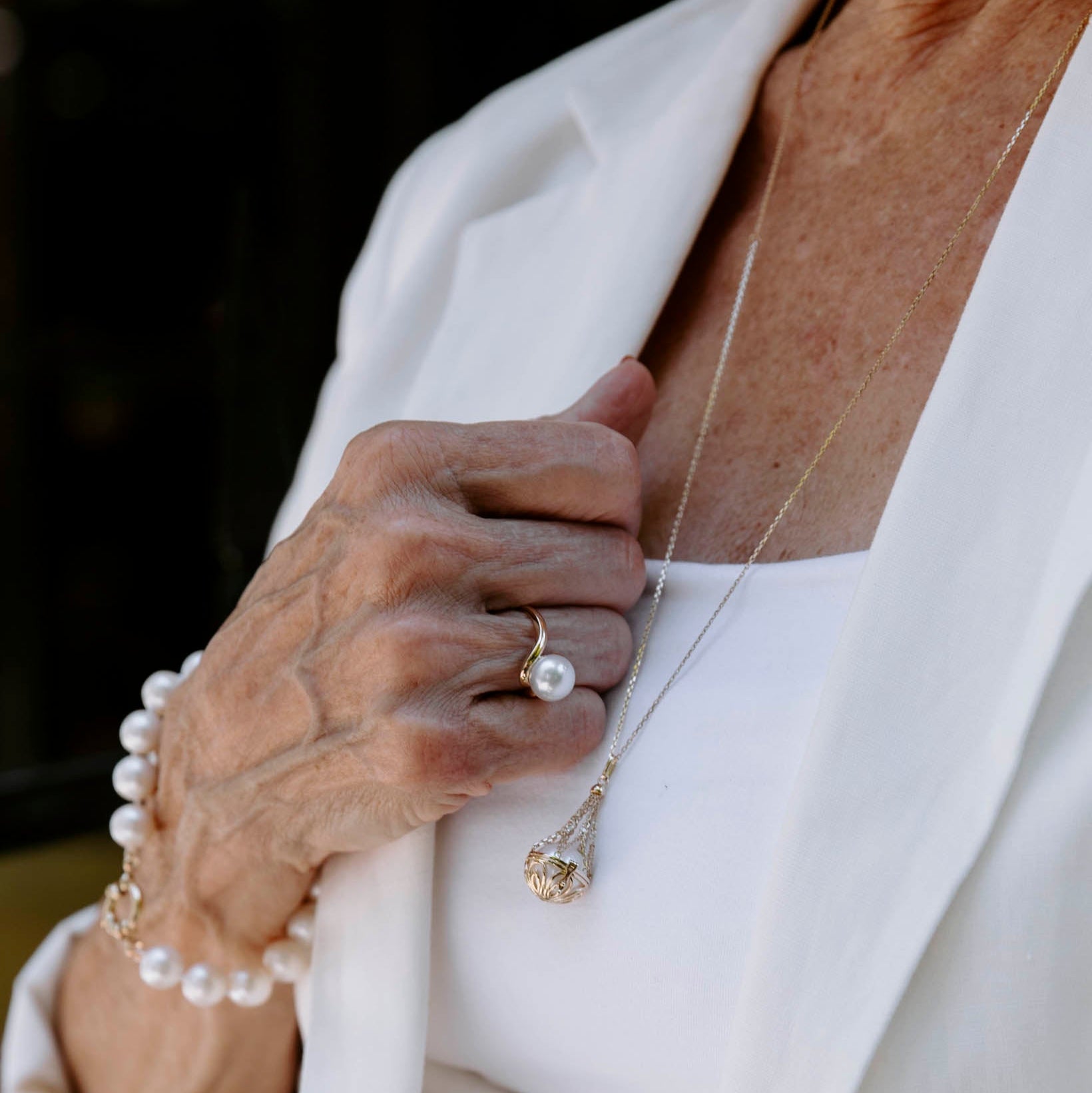 Intricately designed by Erica, this exquisite and refined pearl necklace features a diamond-encased basket. Set in 9ct Gold, it showcases your preference for either a white Round Edison or South Sea Pearl, with the option to switch to pearls of different colours. This stunning necklace offers versatility with three adjustable lengths of 50cm, 60cm, and 70cm, allowing you to wear it according to your preference.