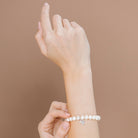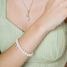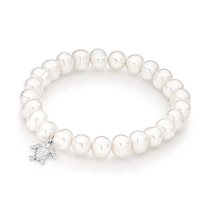 Introducing our captivating Pearl Bracelet with Turtle Charm Pendant—an elastic bracelet that beautifully combines elegance and marine charm. The turtle charm is crafted from sterling silver and adorned with cubic zirconia detailing, adding a subtle sparkle. This bracelet is a stunning embodiment of the sea's mystique and the timeless allure of pearls, perfect for those who cherish the beauty of both nature and fine jewellery.