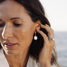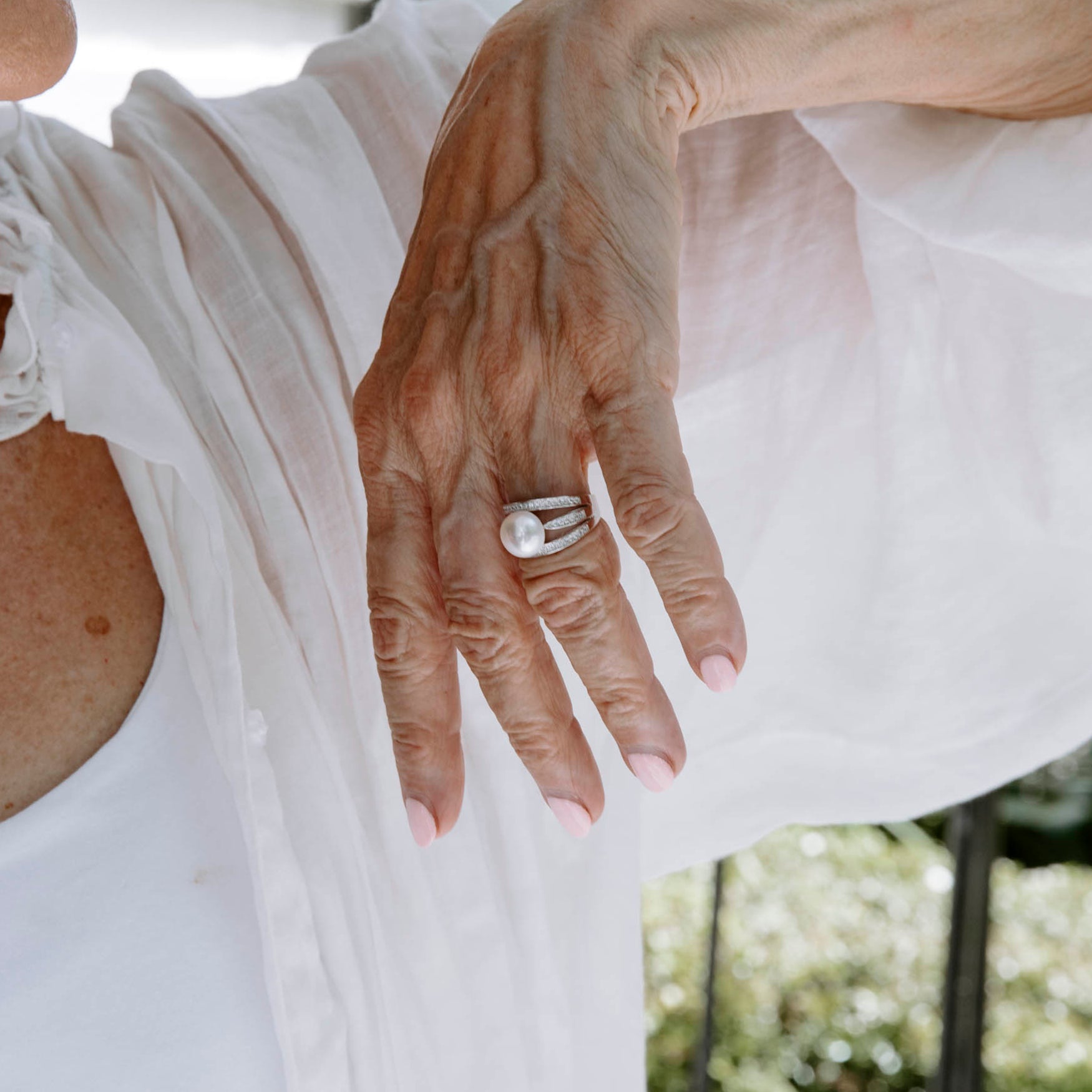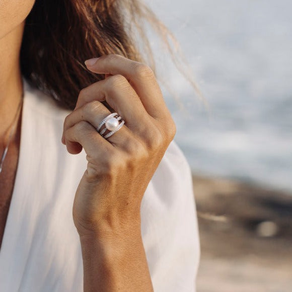 Level up your look with our sterling silver ring, showcasing three bands. The central band gracefully tapers towards a radiant white button freshwater pearl, accentuated by sparkling cubic zirconias—an exquisite blend of sophistication and elegance.