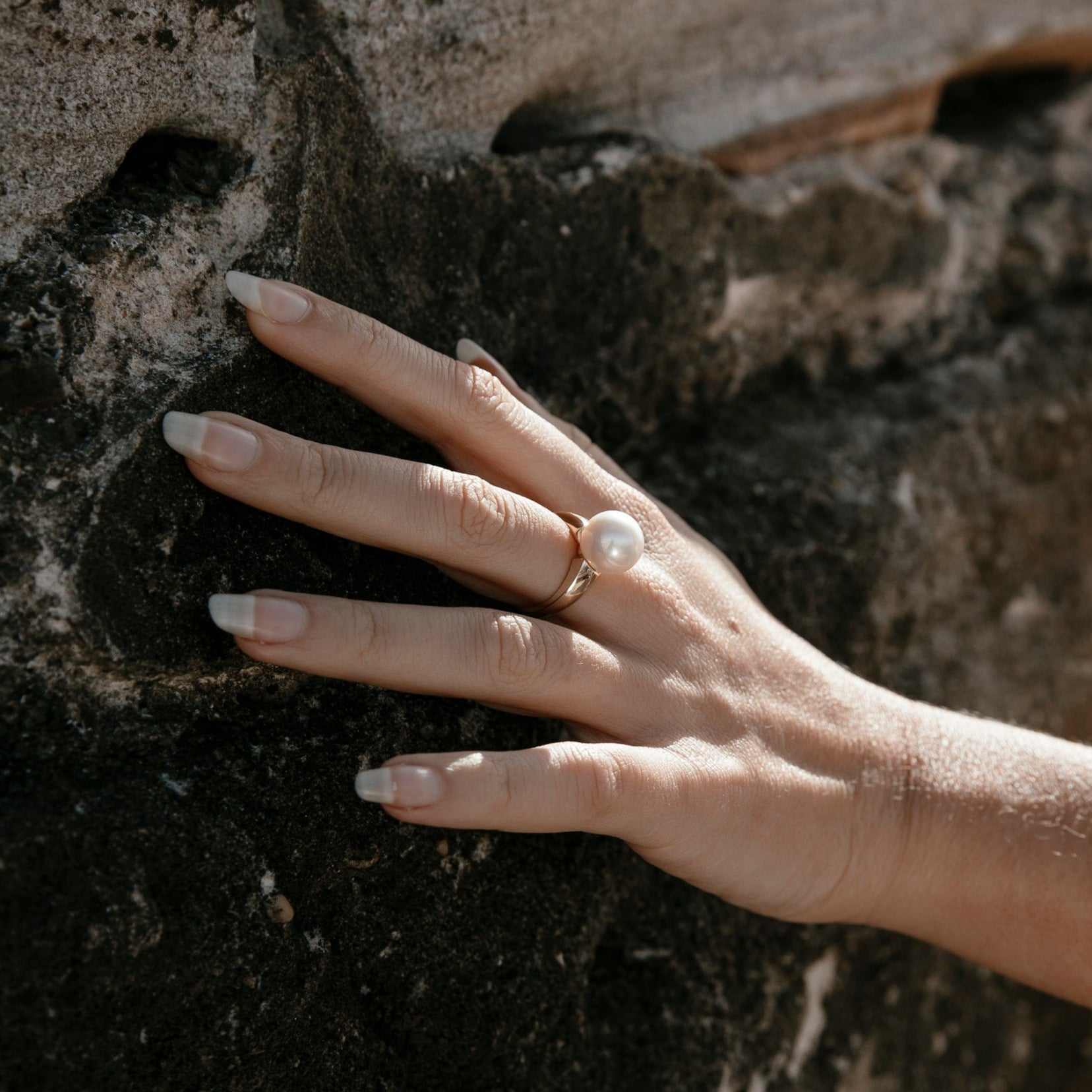 Elevate your style with our 9ct gold band ring featuring a generously sized round Edison pearl, available in timeless white or natural pink. Effortlessly versatile, this piece is the epitome of understated elegance, perfect for any occasion.
